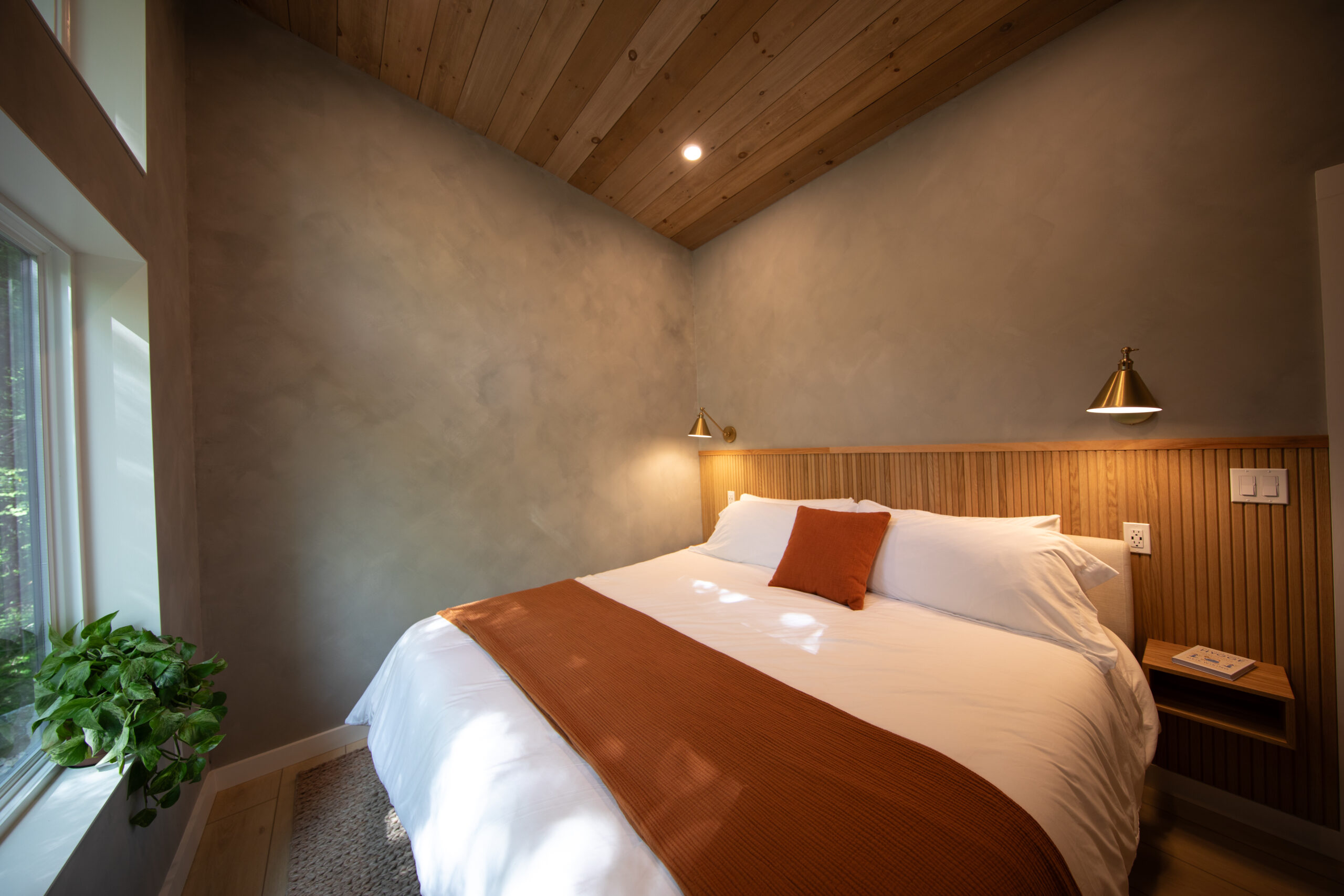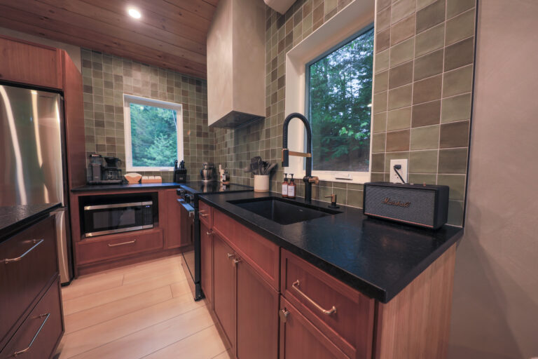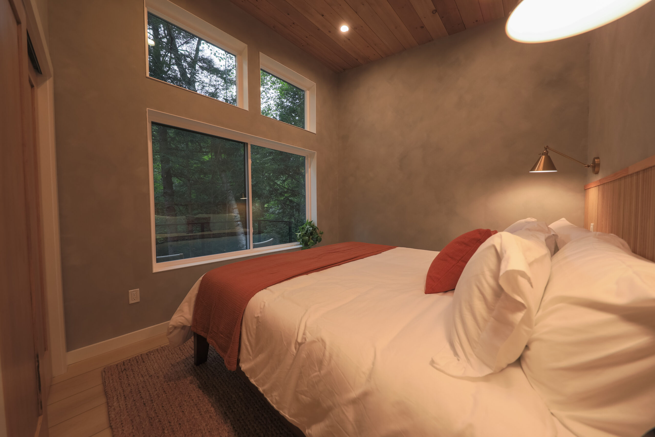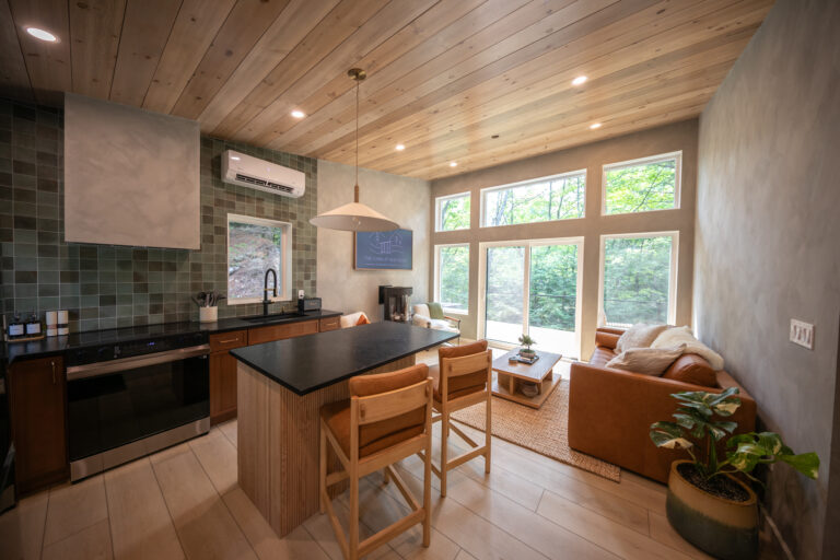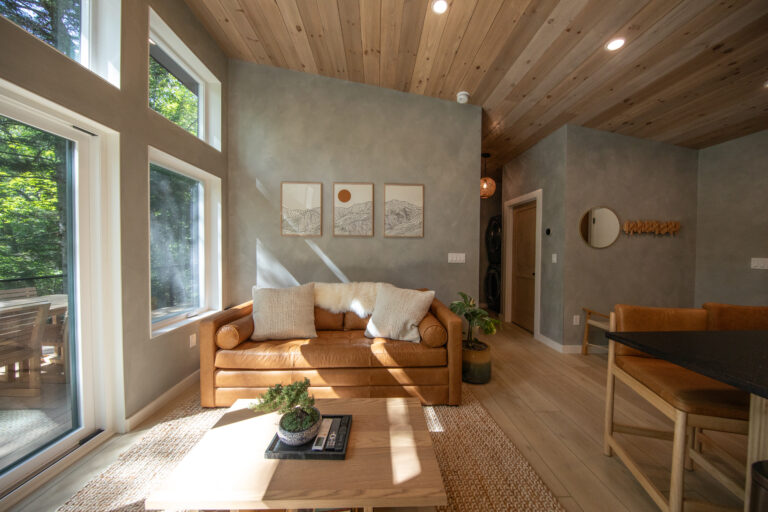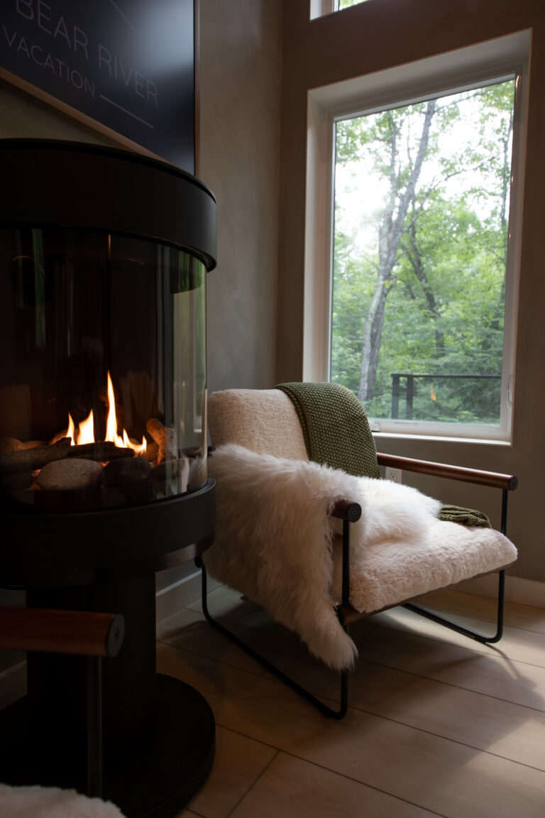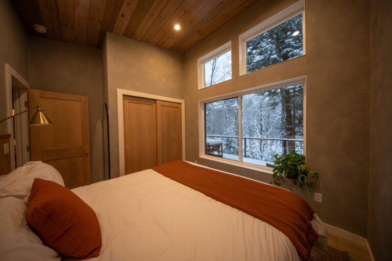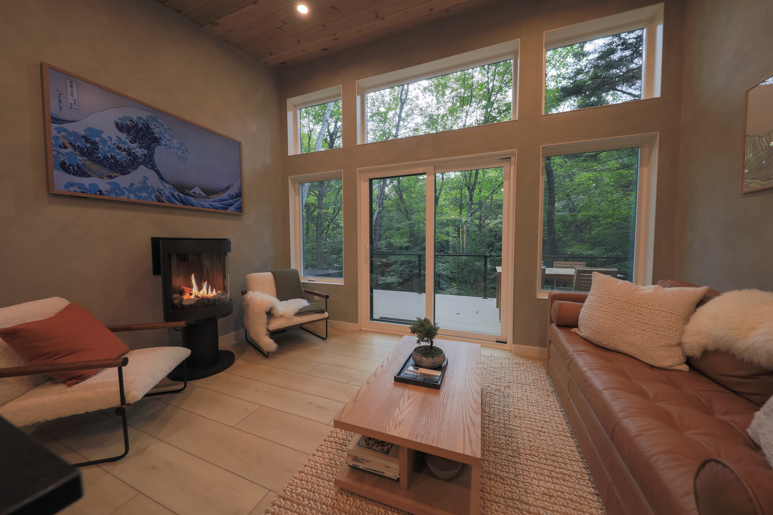 Immerse yourself in the serene elegance of our Japandi-inspired cabin, where thoughtful details and natural materials create a calming atmosphere. Floor-to-ceiling windows invite the surrounding beauty inside, ensuring you feel connected to nature in every corner.
