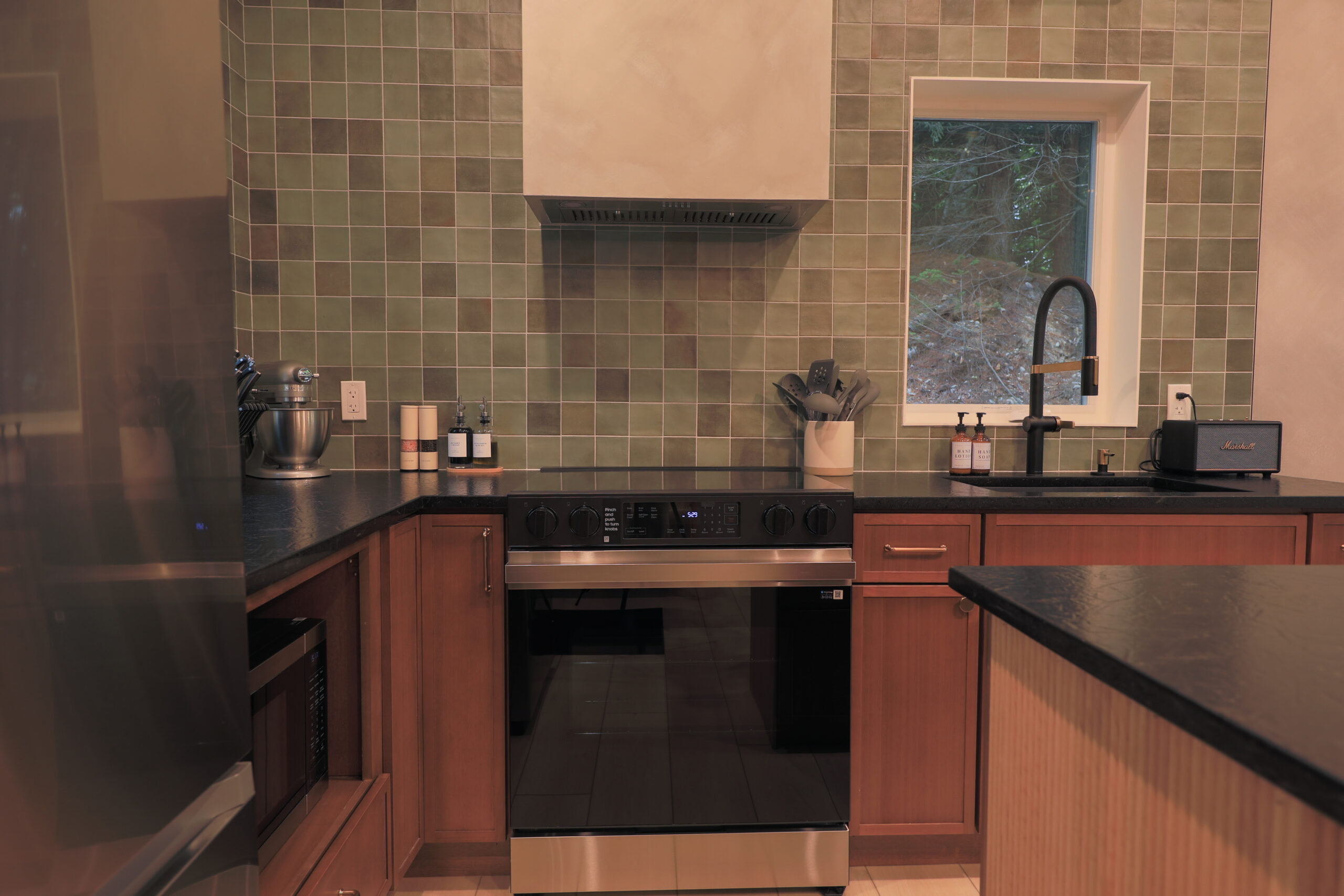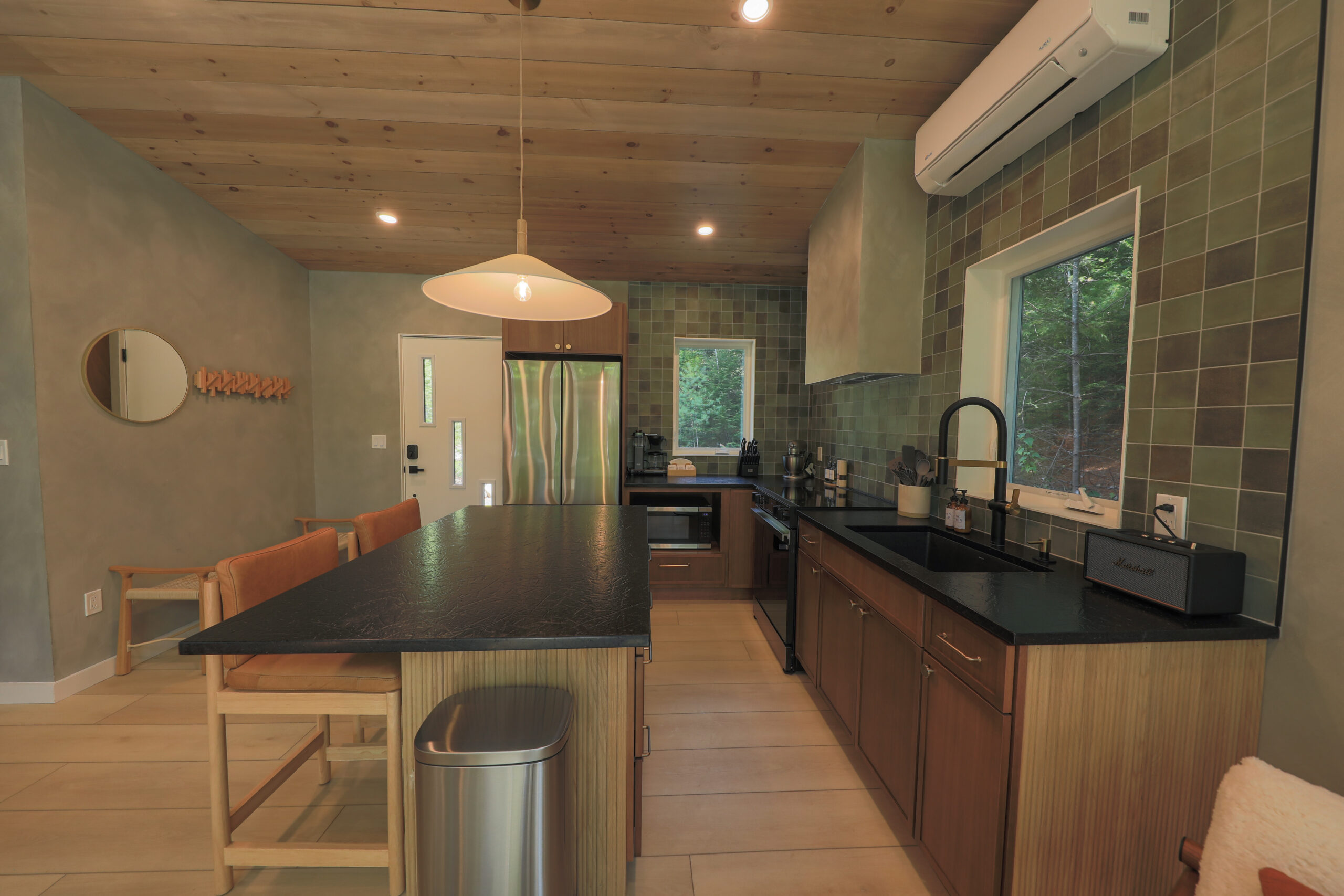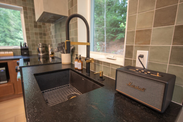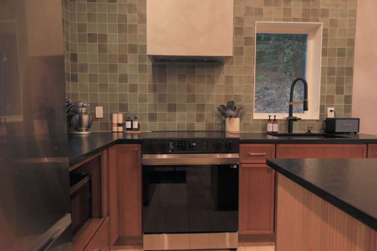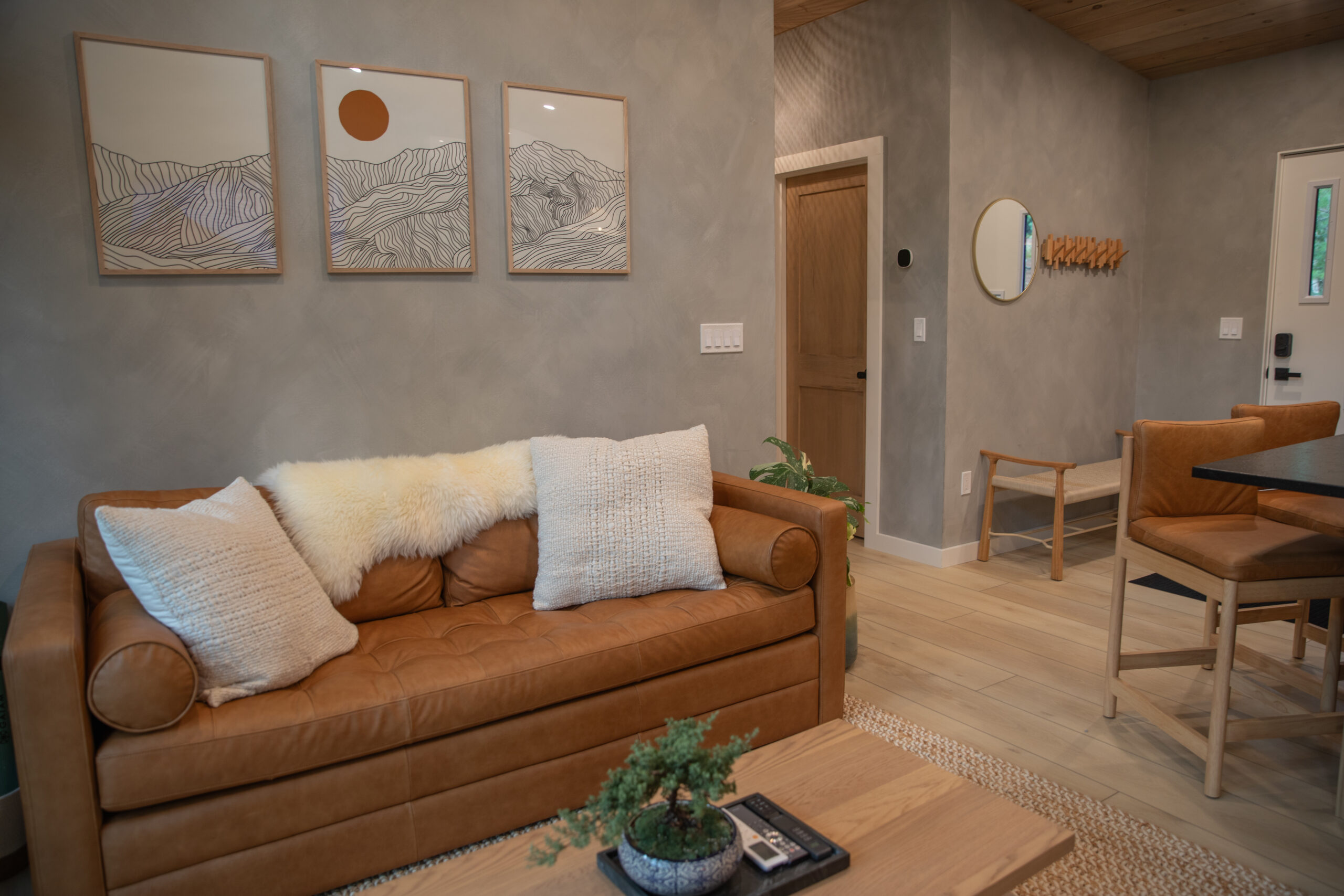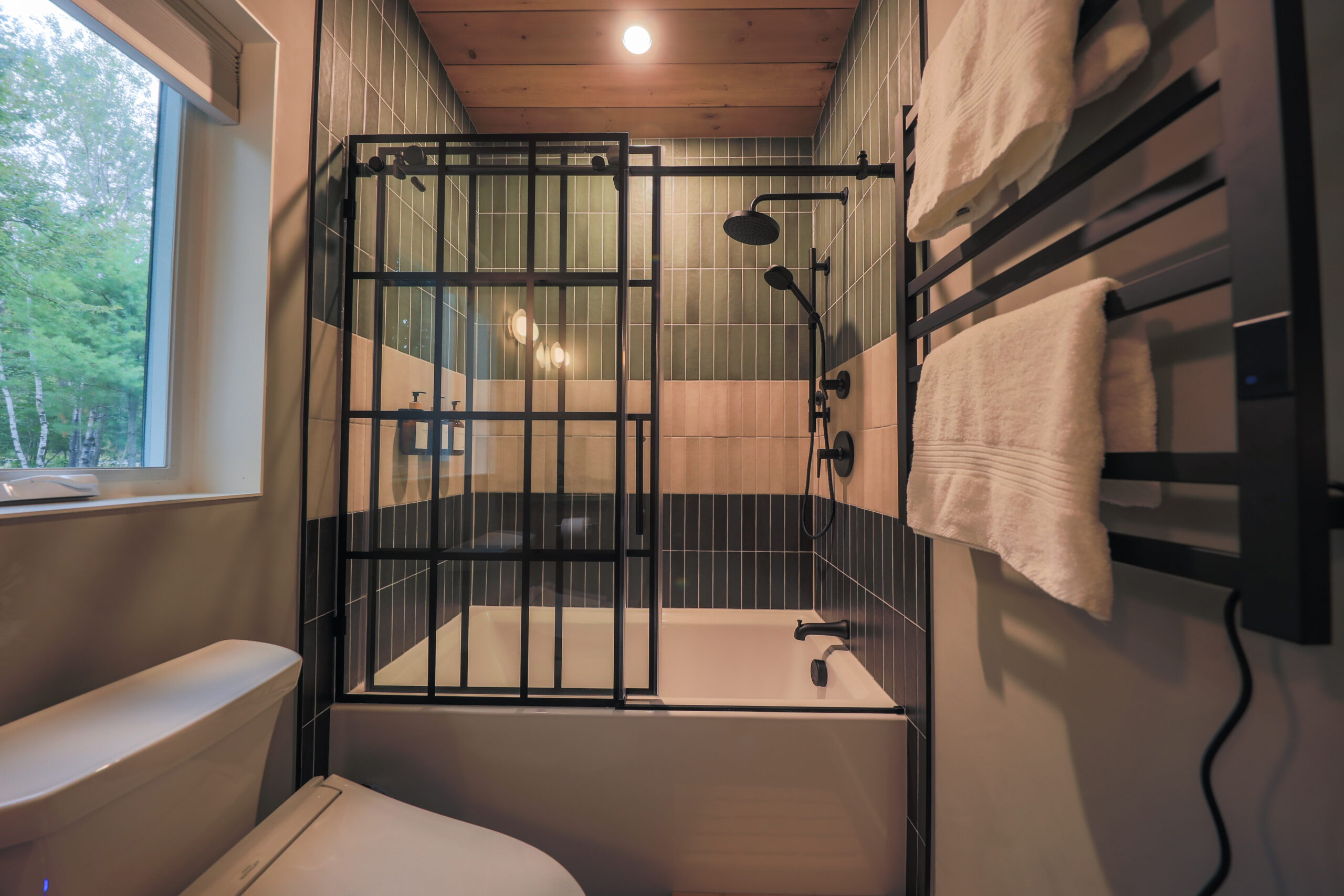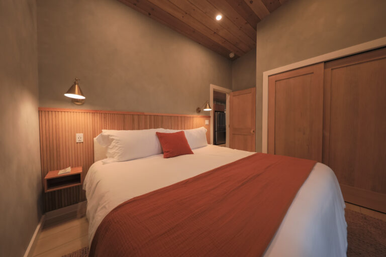 Immerse yourself in the serene elegance of our Japandi-inspired cabin, where thoughtful details and natural materials create a calming atmosphere. Floor-to-ceiling windows invite the surrounding beauty inside, ensuring you feel connected to nature in every corner.